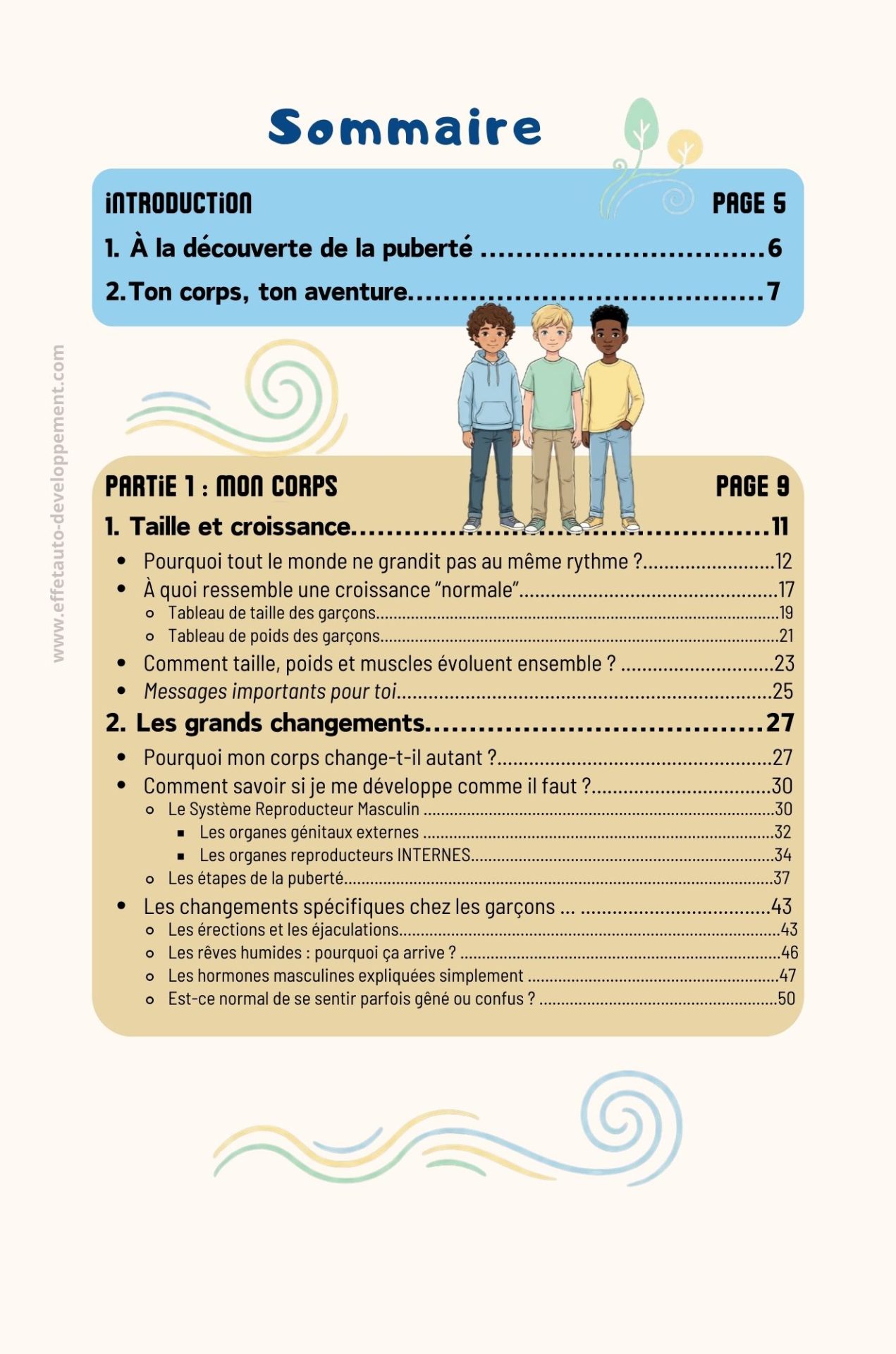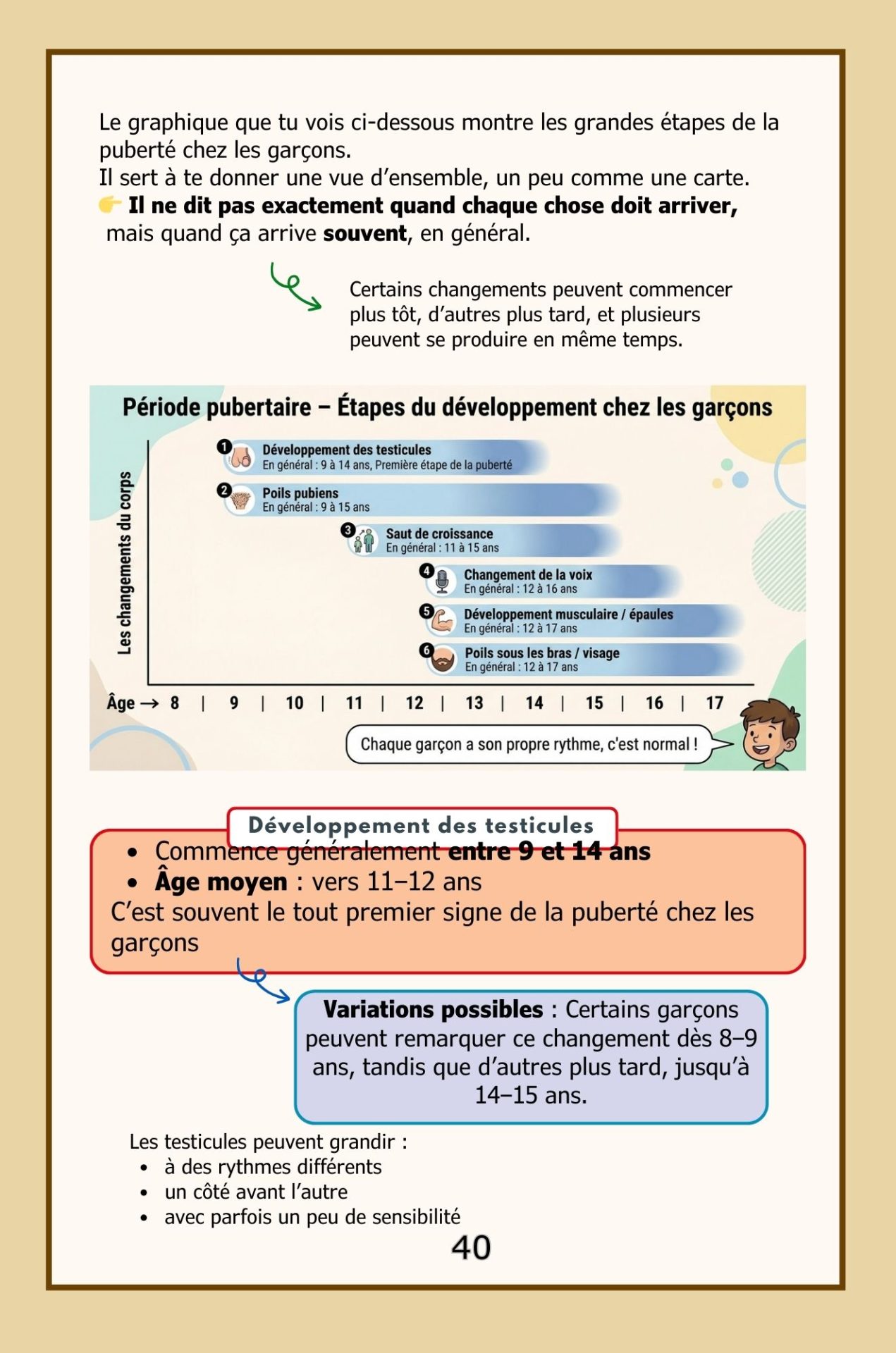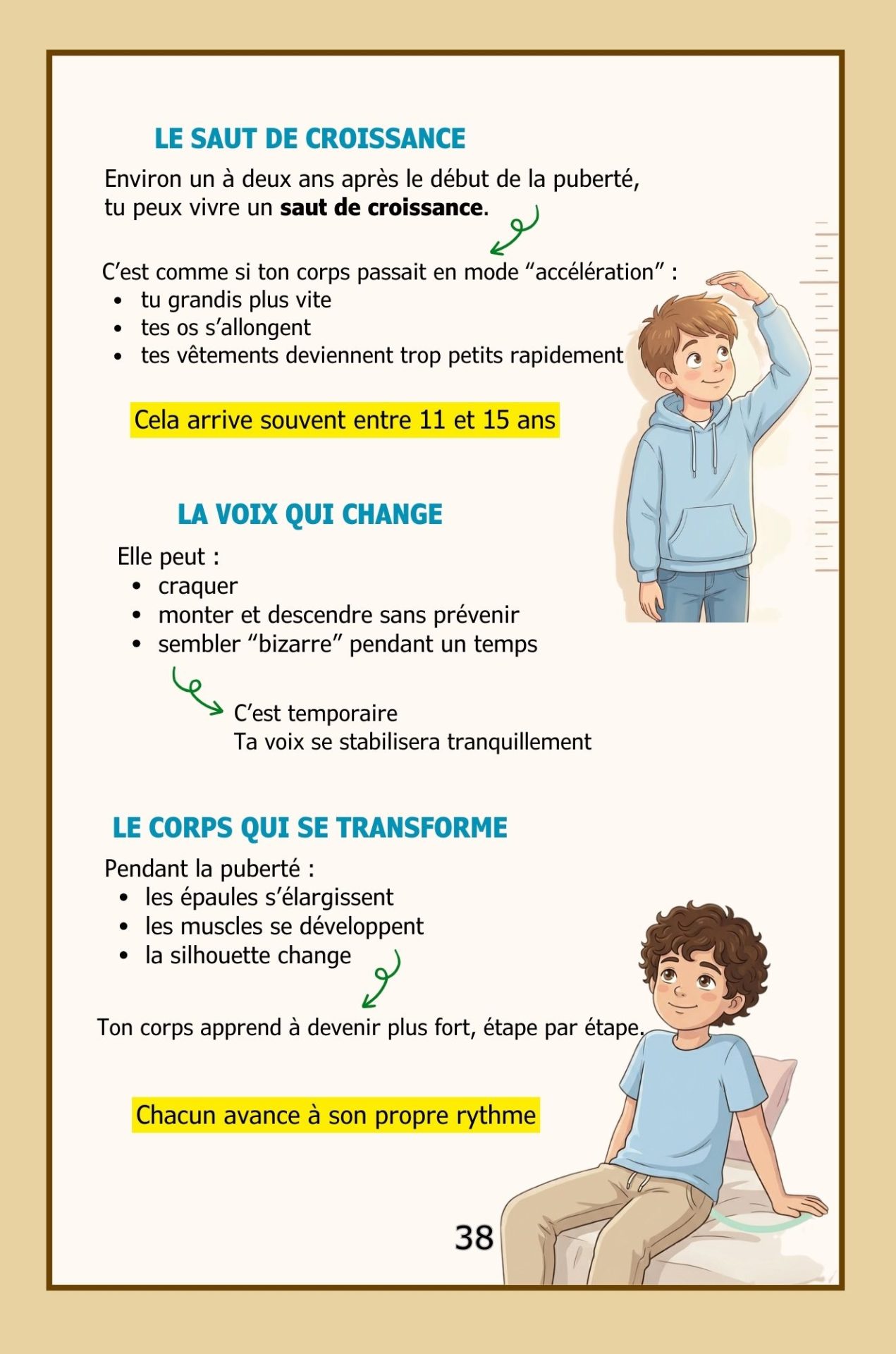 Conçu comme un outil éducatif ouvert et rassurant, il explique les changements physiques, émotionnels et hormonaux que vivent les garçons pendant la puberté, tout en normalisant ce qui peut surprendre, inquiéter ou être source de silence.